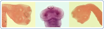 T. solium is known in humans as the “pork tapeworm”, as the organism, seen above, is transmitted by ingesting tapeworm larval cysts known as cysticerci in the metacestode stage present in under-cooked, infected pork. The tapeworm parasitizes the gut of the human definitive host causing eggs to be shed in the stool which can then infect themselves and others with another, more serious form of the disease in which the human is then also serving as the intermediate host. What a double whammy! Generally, tapeworm infections are mild and can go unnoticed for long periods, but if the eggs of the tapeworm are ingested by humans or pigs (pigs usually serve as the intermediate host), this can cause an infection known as cysticercosis in which the eggs develop into larvae and form cysts within various organs and tissues. When these invasive larvae enter the central nervous system they can cause dangerous neurological symptoms in humans (neurocysticercosis), including epileptic seizures, which can be fatal.